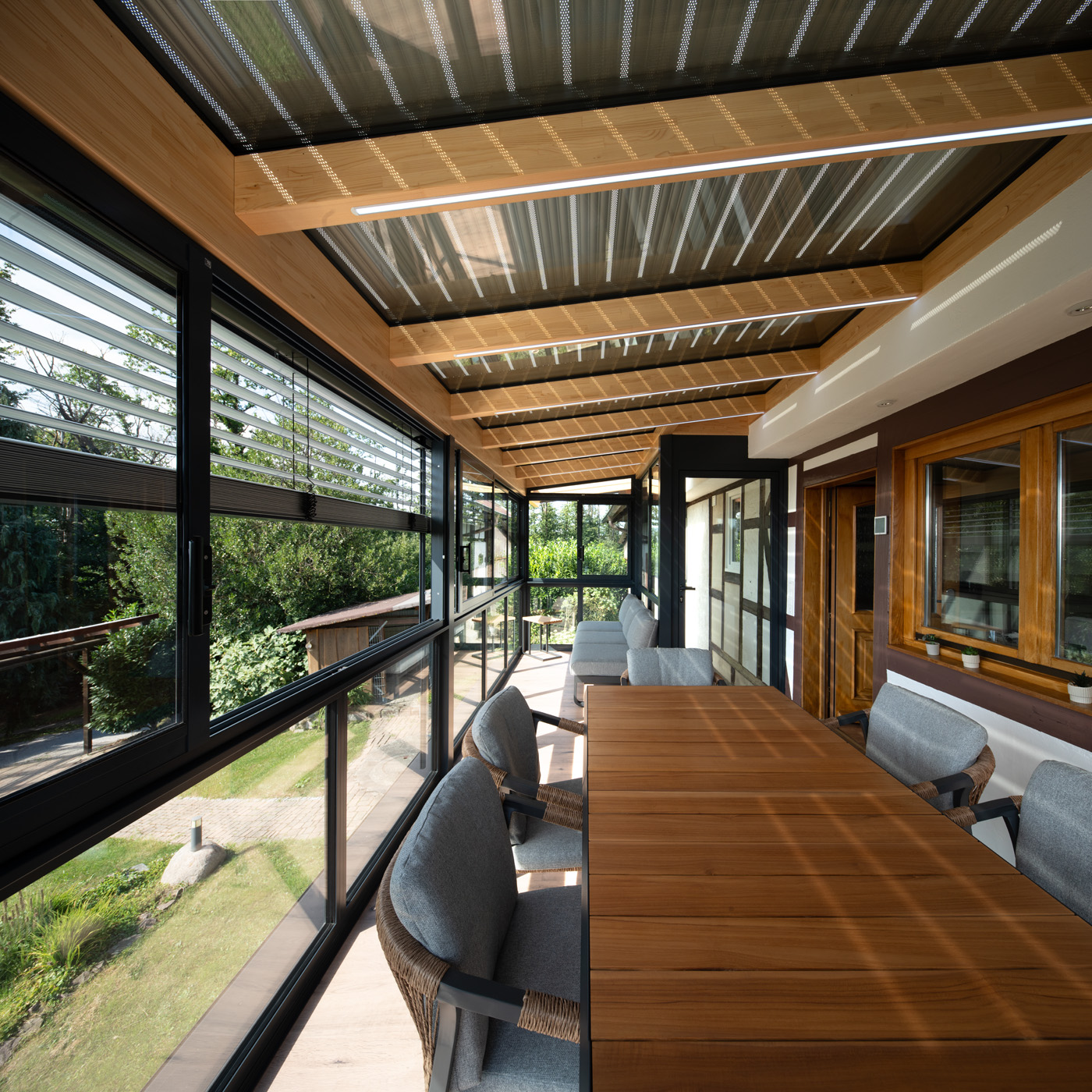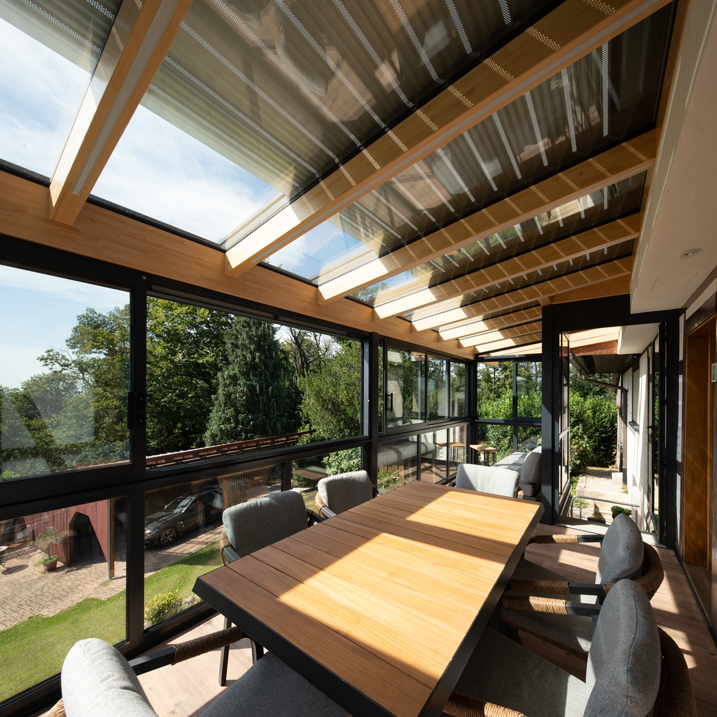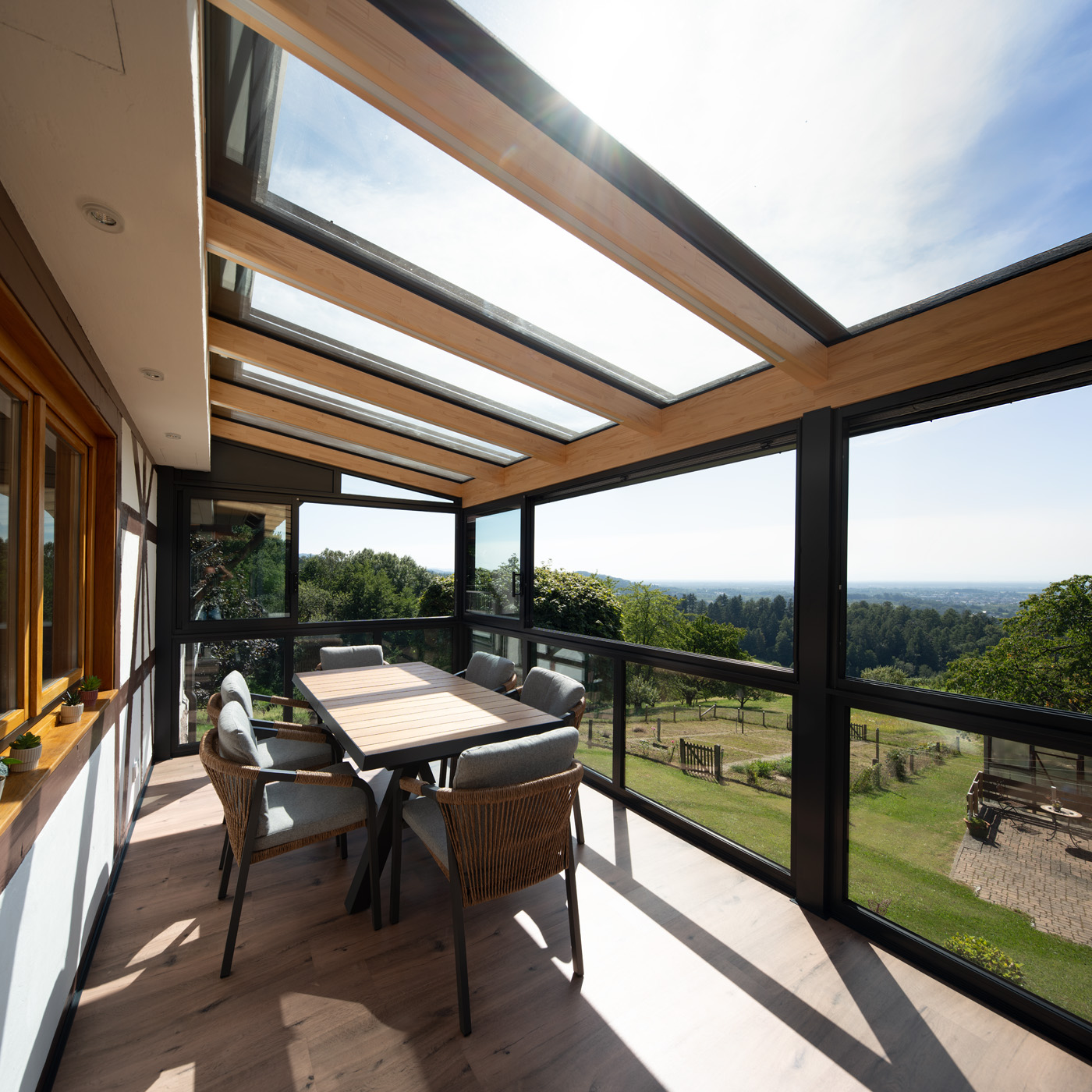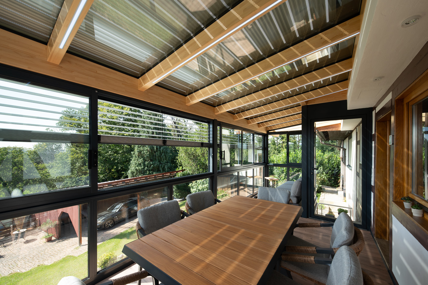 Durch die großflächige Verglasung entsteht ein harmonischer Übergang zwischen Innen- und Außenbereich. Der Raum bietet eine offene, helle Atmosphäre und lädt zum Verweilen ein – sei es beim Frühstück in der Morgensonne, beim Lesen am Nachmittag oder beim gemütlichen Beisammensein mit Freunden am Abend.
