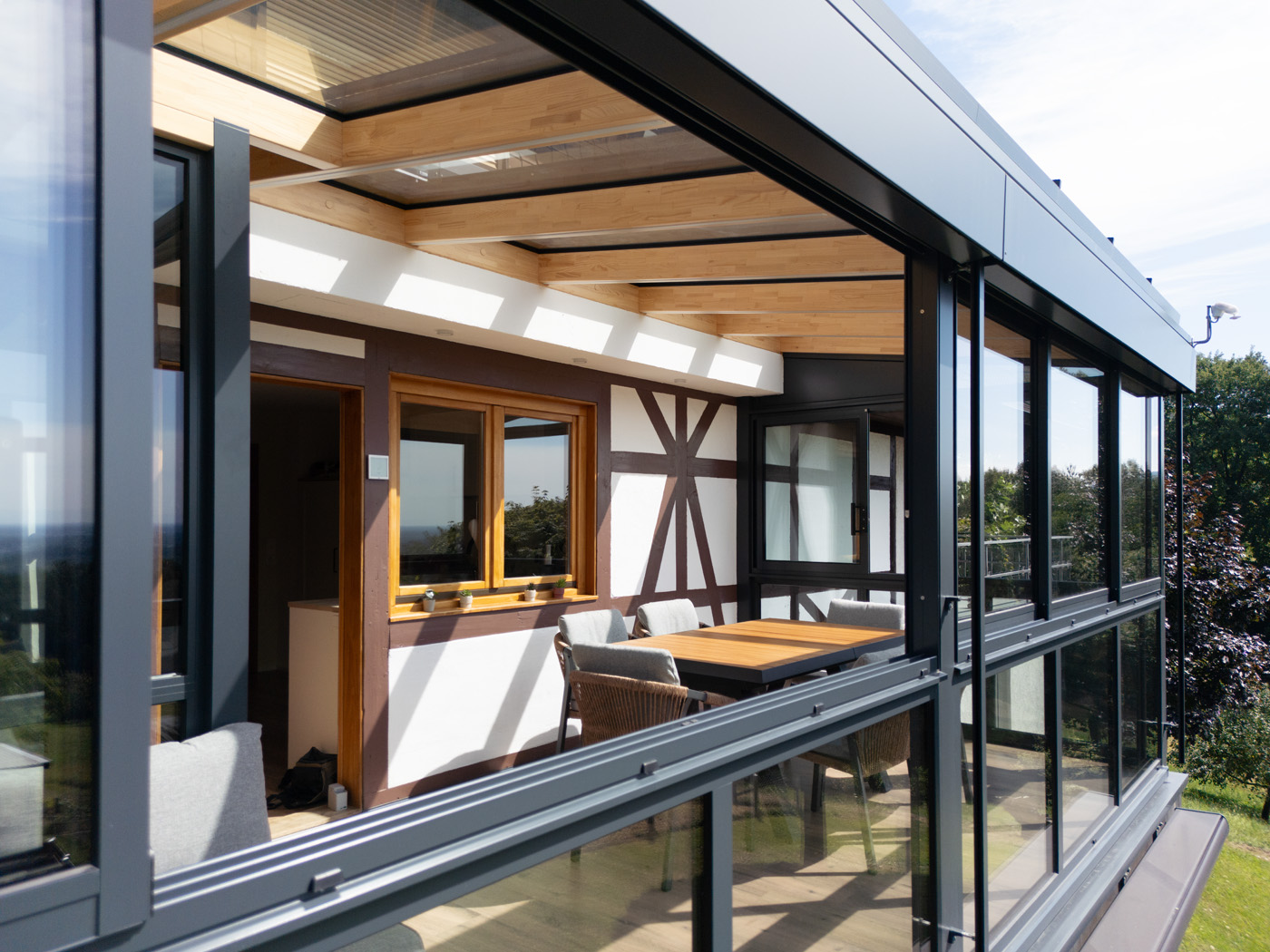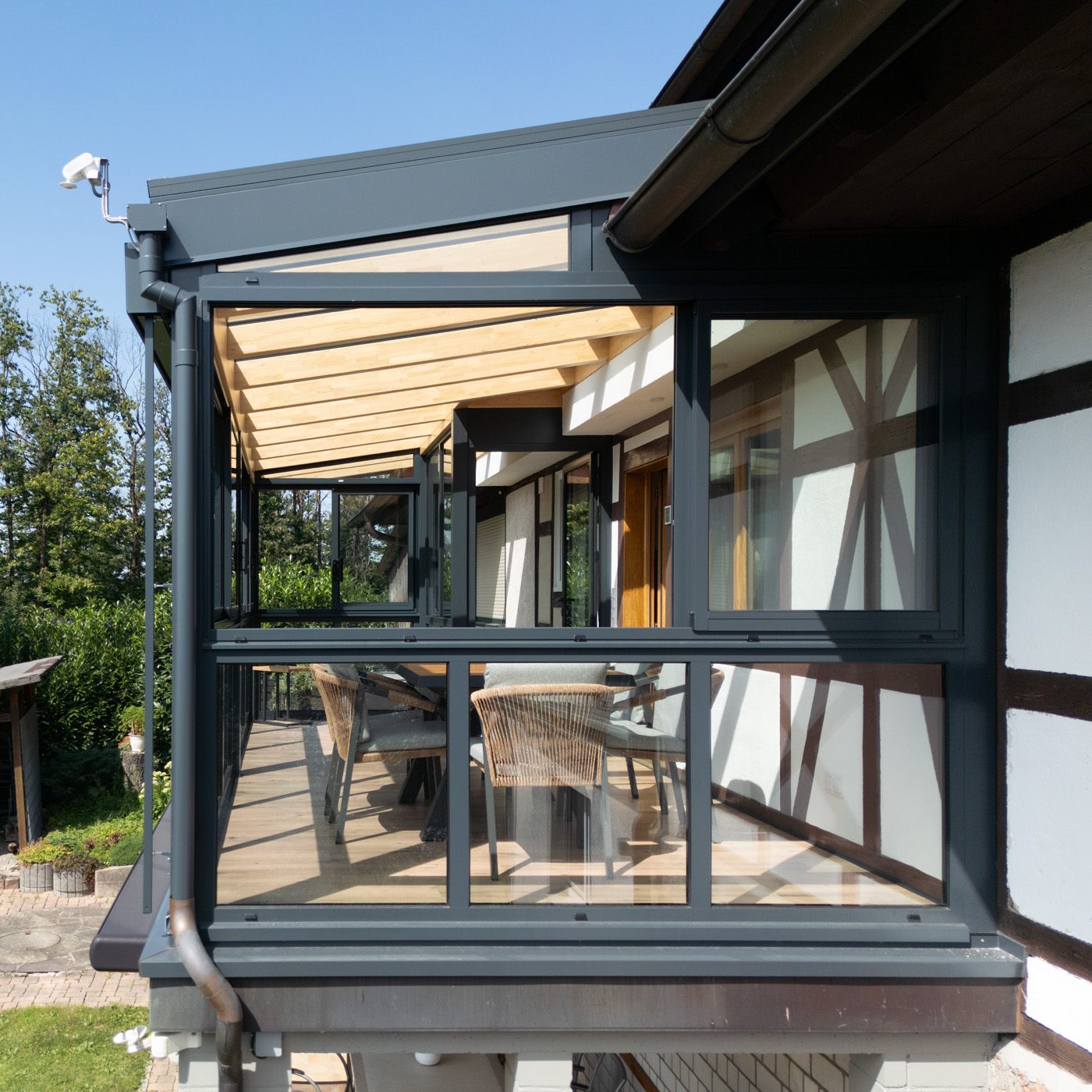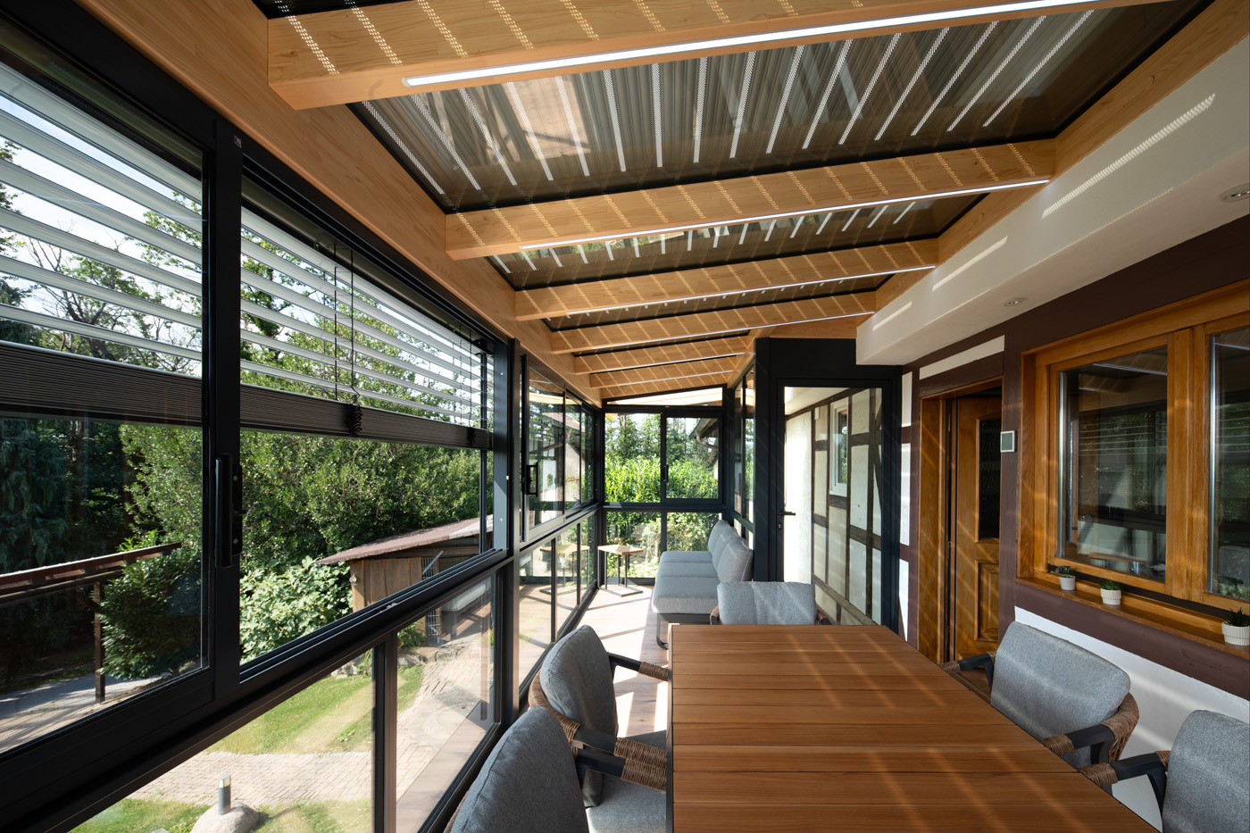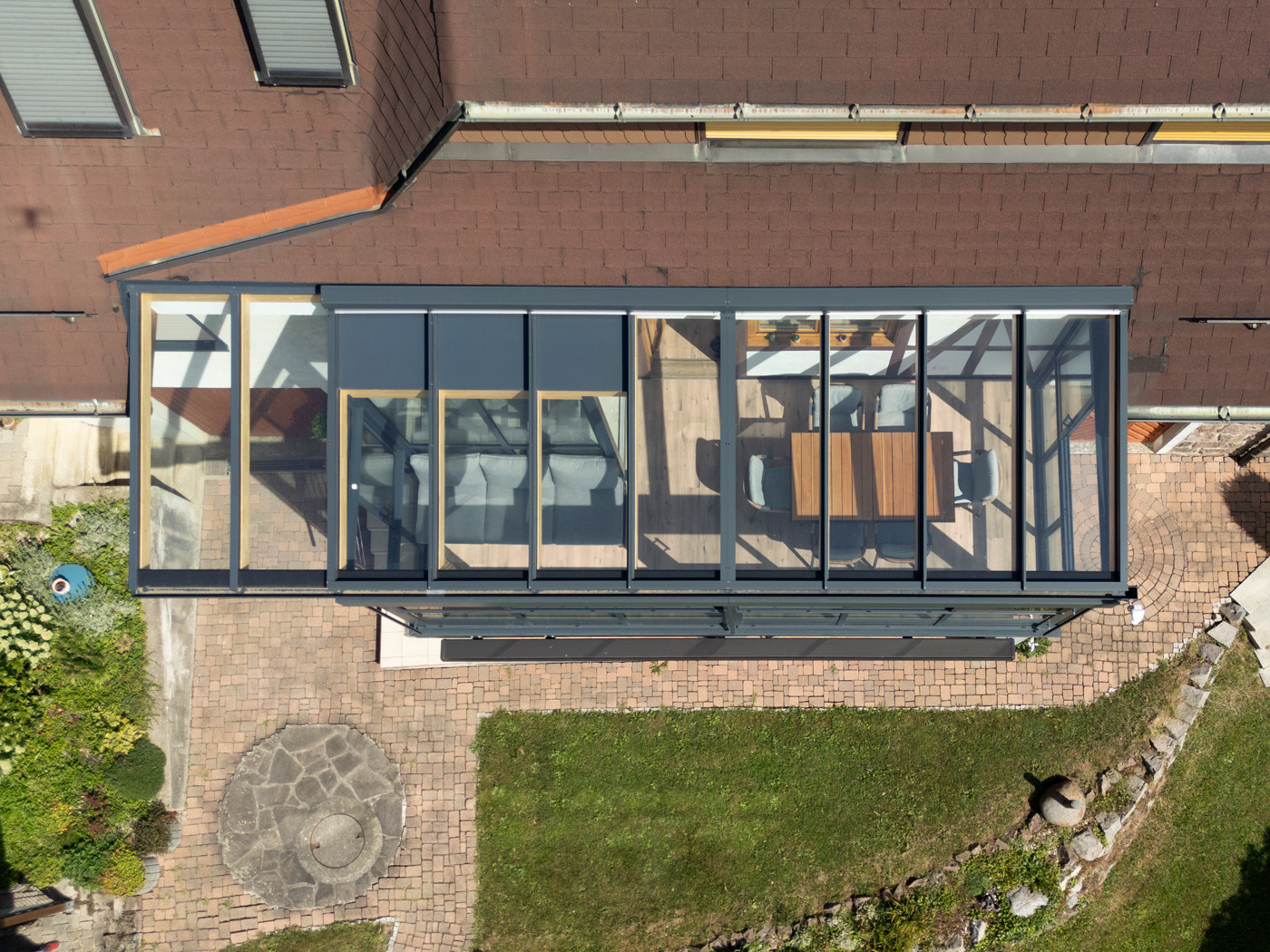 Durch die großflächige Verglasung entsteht ein harmonischer Übergang zwischen Innen- und Außenbereich. Der Raum bietet eine offene, helle Atmosphäre und lädt zum Verweilen ein – sei es beim Frühstück in der Morgensonne, beim Lesen am Nachmittag oder beim gemütlichen Beisammensein mit Freunden am Abend.