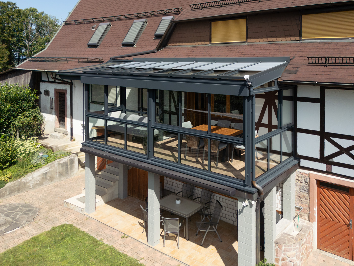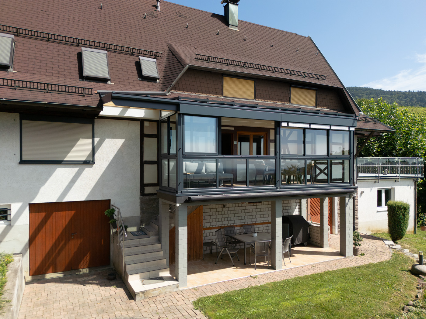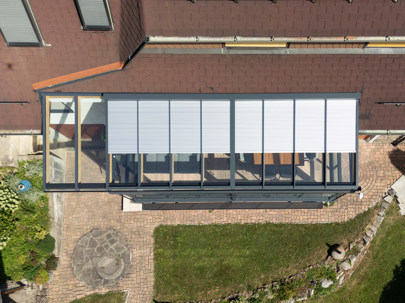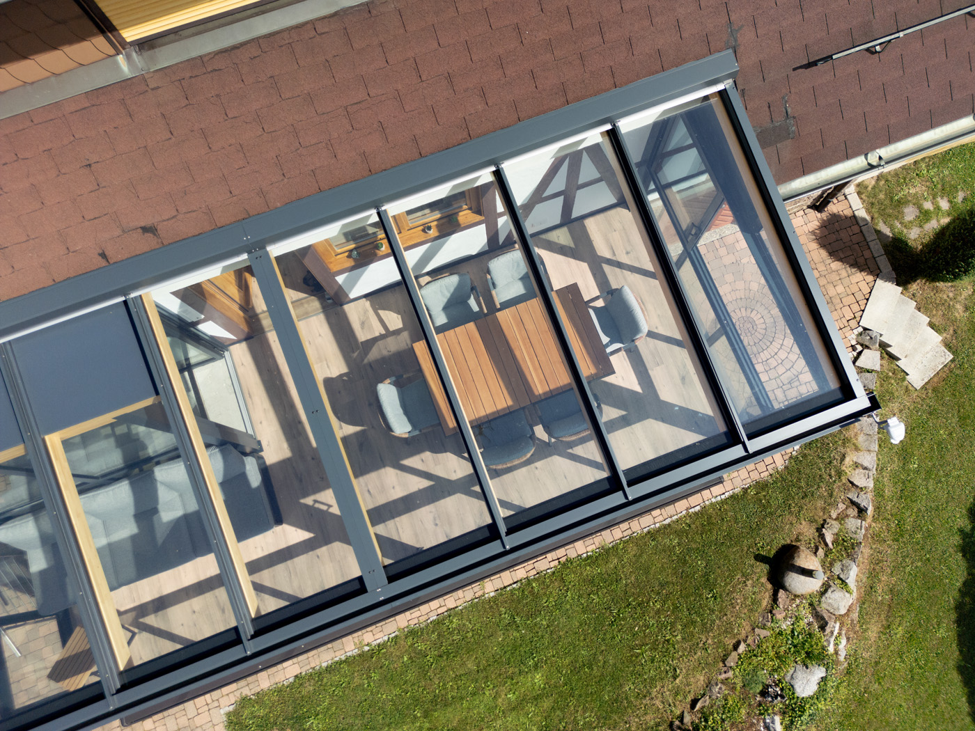Durch die großflächige Verglasung entsteht ein harmonischer Übergang zwischen Innen- und Außenbereich. Der Raum bietet eine offene, helle Atmosphäre und lädt zum Verweilen ein – sei es beim Frühstück in der Morgensonne, beim Lesen am Nachmittag oder beim gemütlichen Beisammensein mit Freunden am Abend.