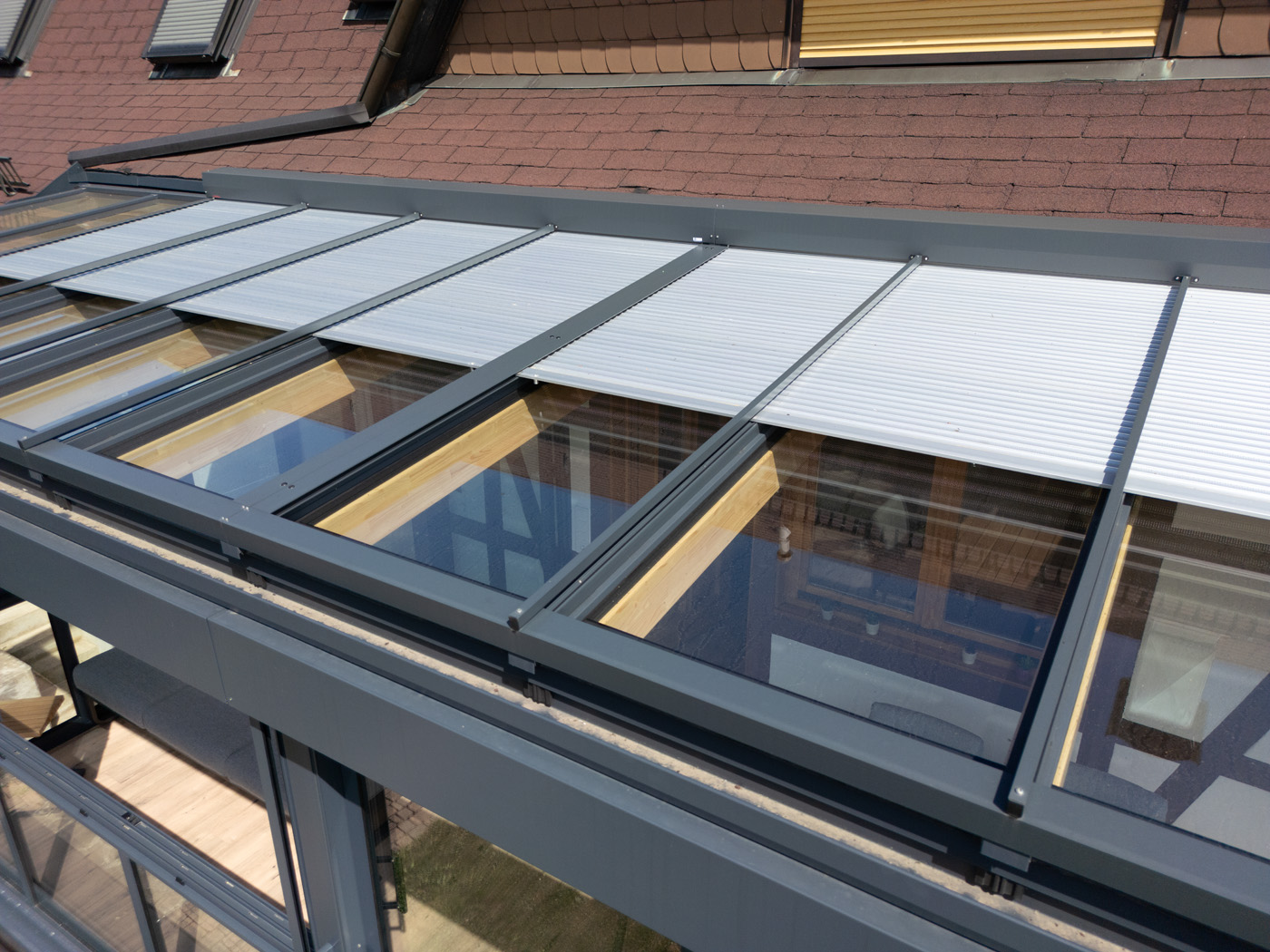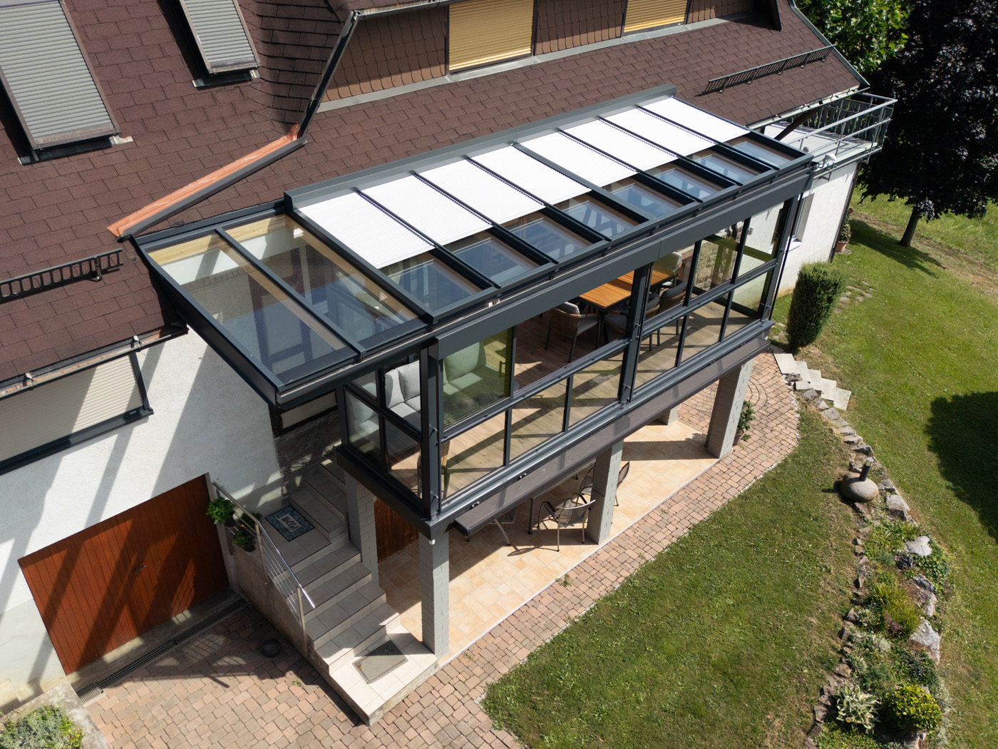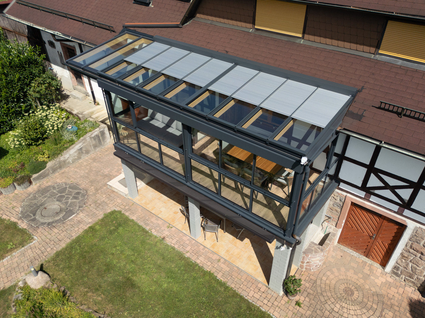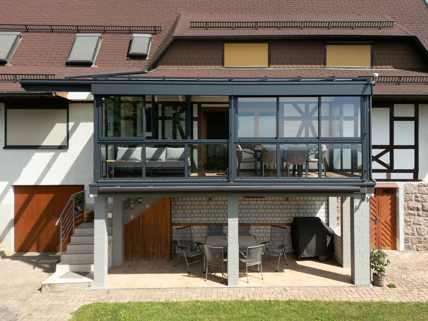 Ein besonderes Highlight ist die überdachte Terrasse direkt unter dem Wintergarten. Sie bietet zusätzlichen geschützten Außenraum – ideal für gemütliche Stunden im Freien, auch bei wechselhaftem Wetter. Hier finden sowohl Gartenmöbel als auch ein Grill oder eine Sitzecke problemlos Platz.
