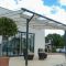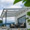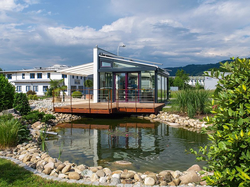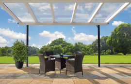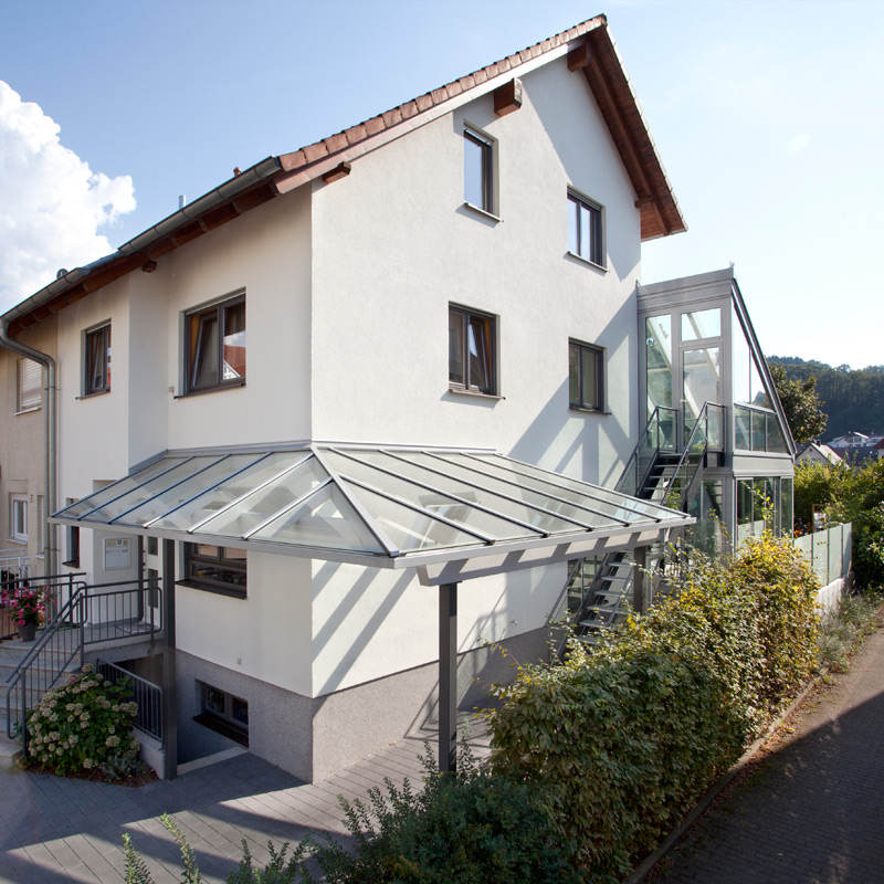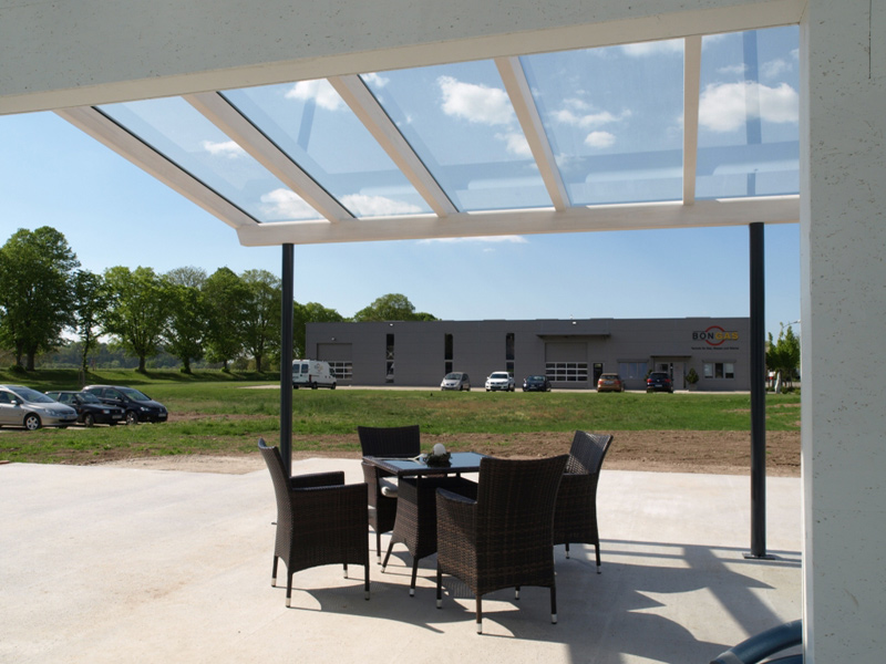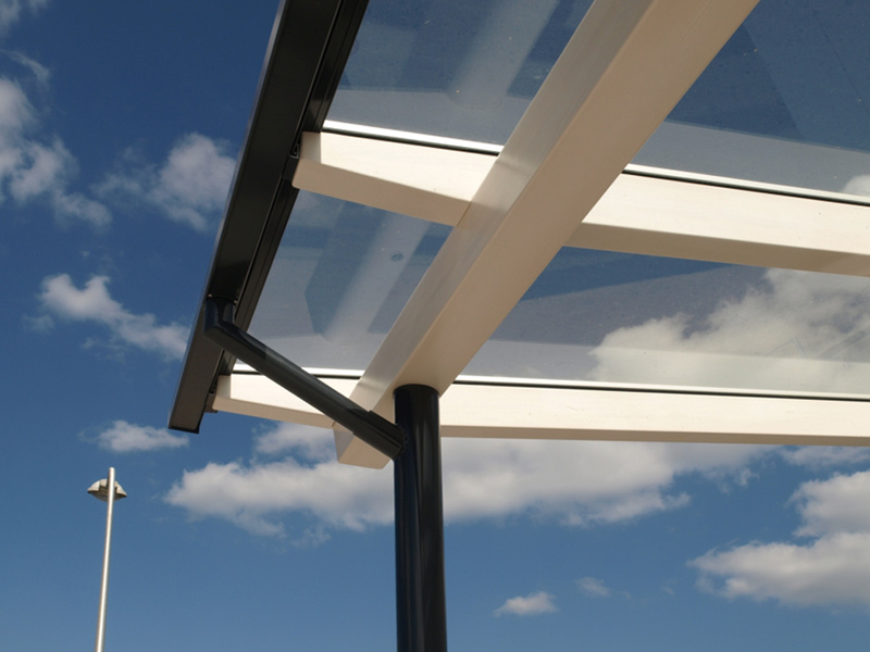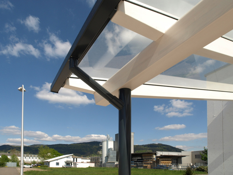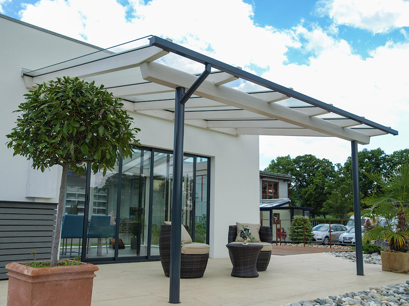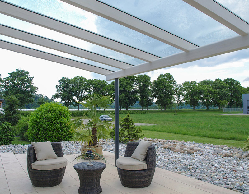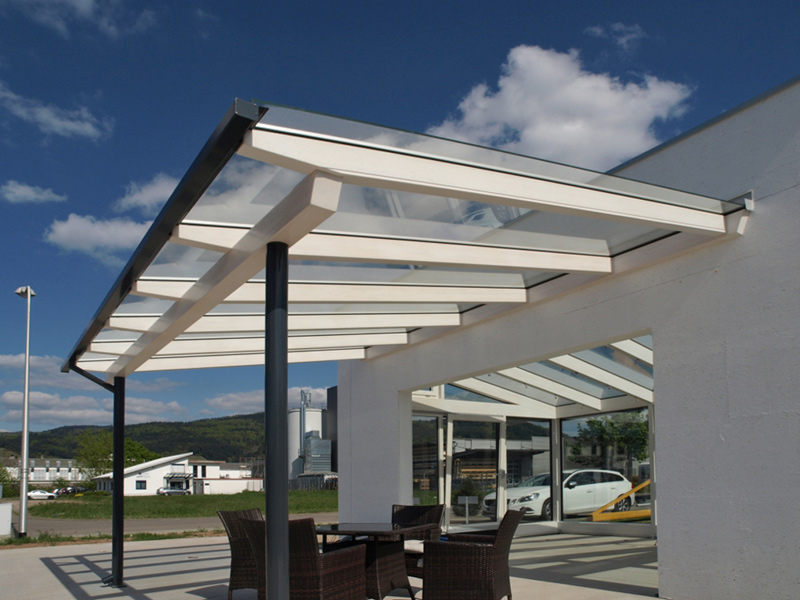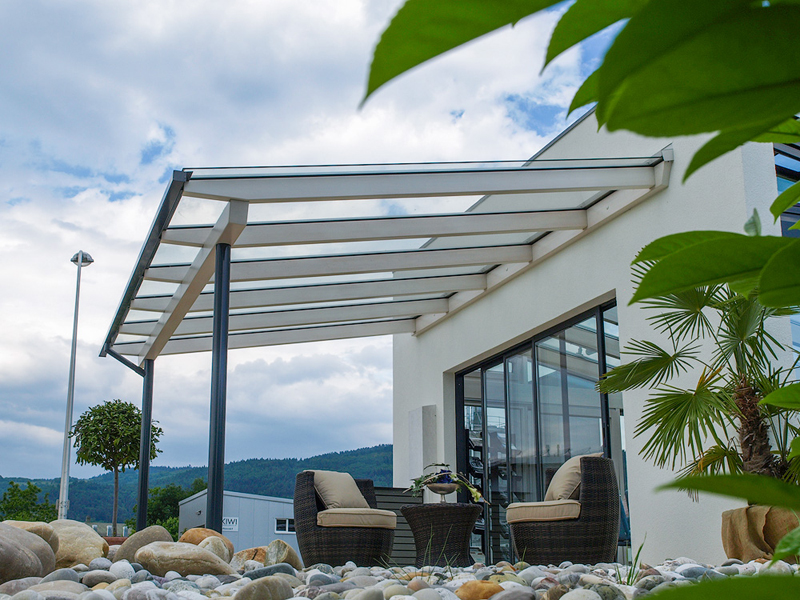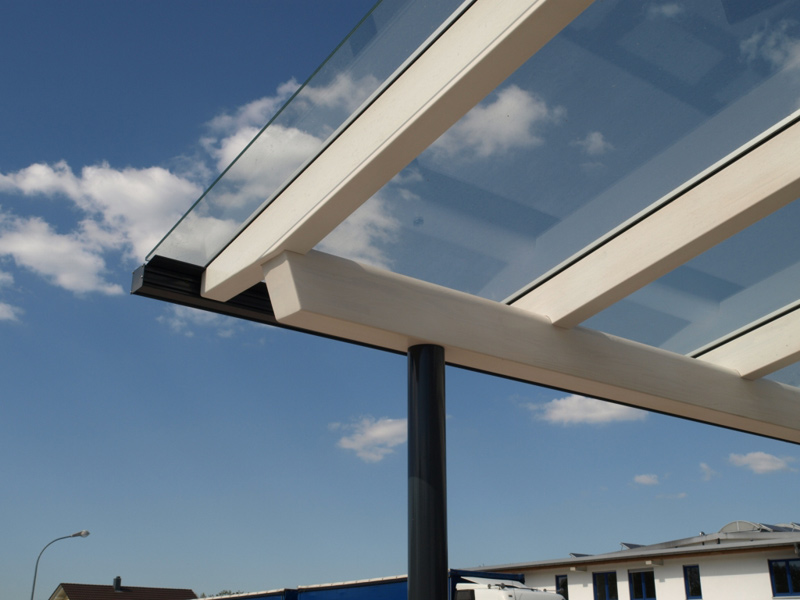 Das neue Frammelsberger Terassendach in filigraner Holz-Alu Konstruktion mit integrierter Stützenentwässerung